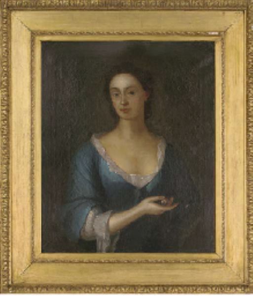 | Portrait of a lady, bust-length, in a blue dress, a flower in her right hand | |