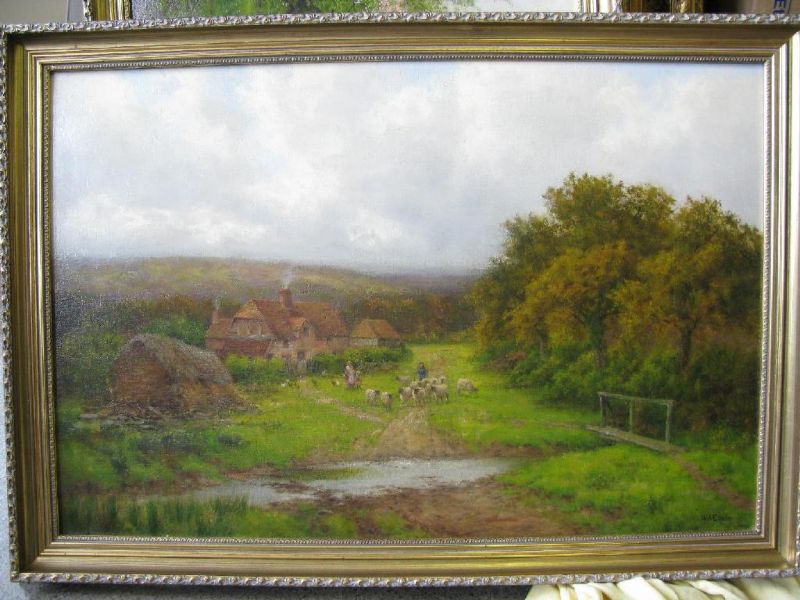 | Figures with sheep and chickens by a farmstead, a stream in the foreground | |