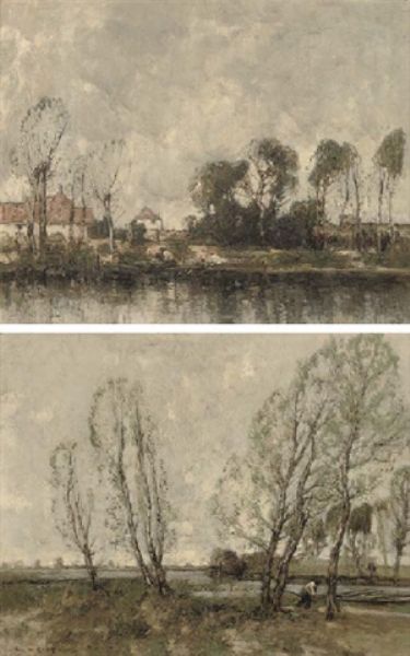 | A figure on a river bank with cottages beyond; and A figure on a riverside track | |