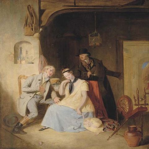 | The Elopement: A young suitor and his lover being pressed by the coachman for a quick getaway | |