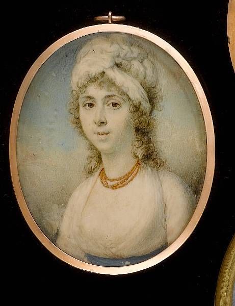 A Lady, wearing white dress, with blue ribbon waistband, white turban and red coral necklace.