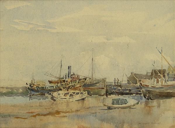 Fishing Boats At Low Tide, figures on the quay