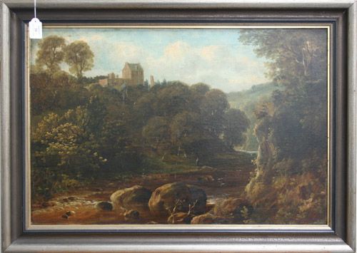 Landscape with an Angler by a River, a Manor House and Castle Ruin in the distance