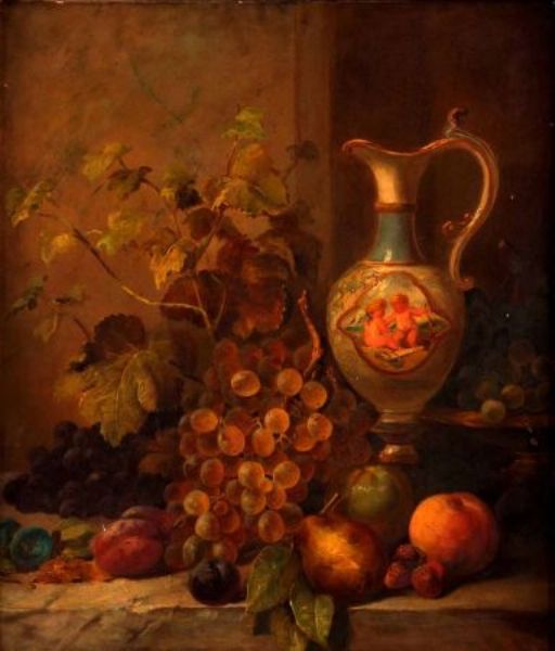 Still Life Study of Mixed Fruit, Porcelain Jug on a Marble Ledge