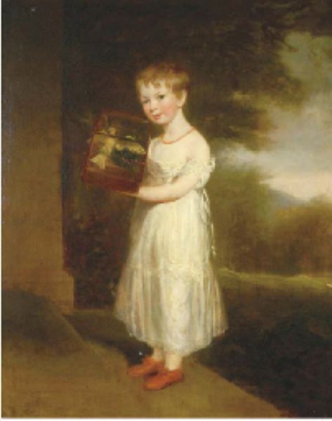 | Portrait of a young girl, full-length, standing in a white dress, holding a birdcage, in a landscape | |