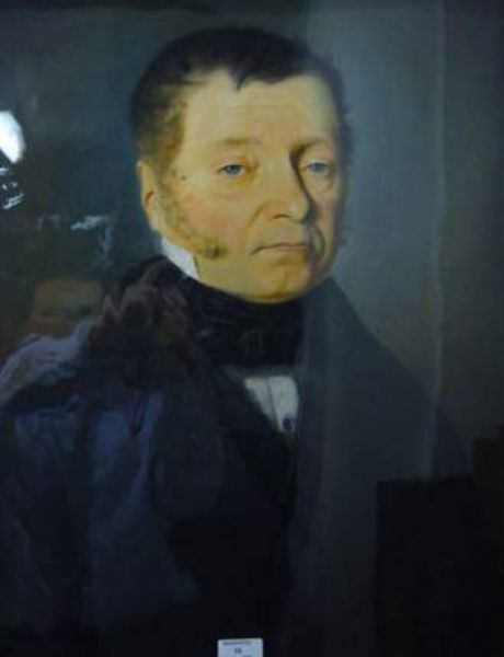 | Portrait d'homme aux yeux bleus, en buste, vêtu d'un gilet, cravate et redingote noirs | |