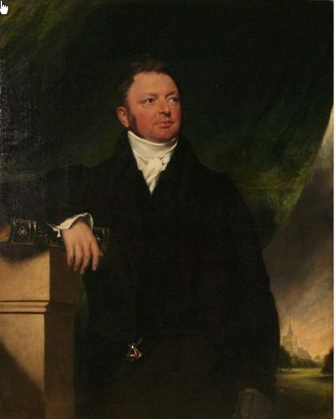| Portrait of a gentleman in a black jacket with one hand resting on the Bible. | |