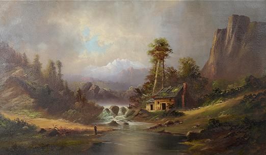 Man Fishing by near Cabin Under the Mountains
