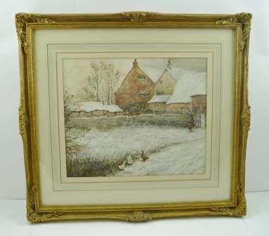 Winter Scene, Midlands Farm, a figure at the gate, geese in the foreground