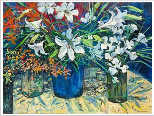 | ORIENTAL LILLIES, WHITE IRIS AND ORCHIDS IN VASES | |