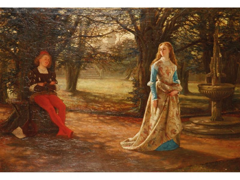 | An historicist painting depicting Elizabethan figures in a garden beside a fountain | |