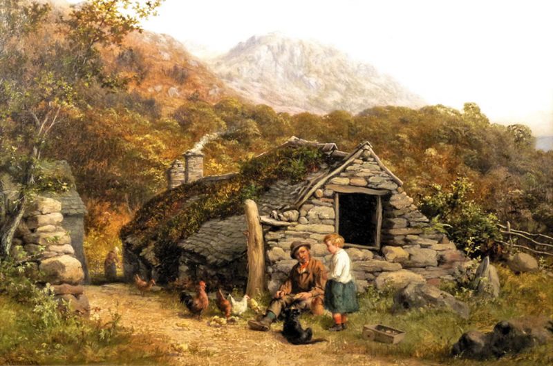 FIGURES WITH FARM ANIMALS OUTSIDE A COTTAGE
