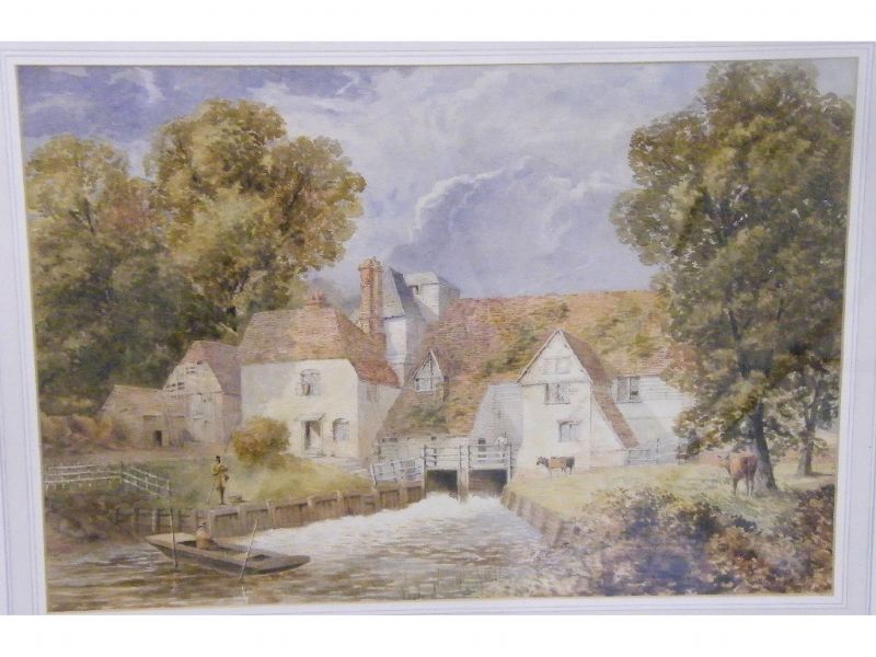 Figures and cattle at a water mill,