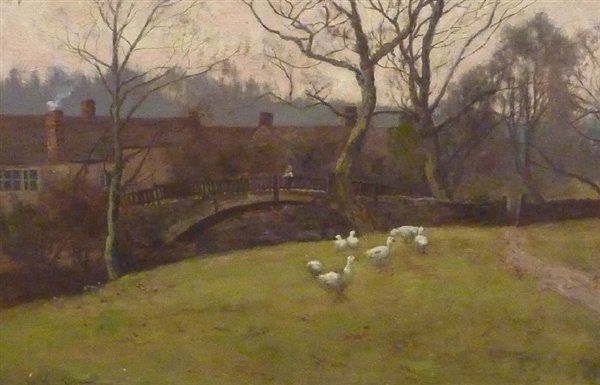 Beckfoot Bridge and Cottages Bingley with Ducks in the foreground
