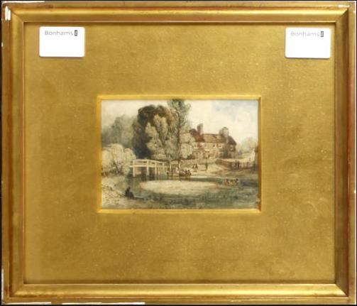 Figures before a house, stream and bridge