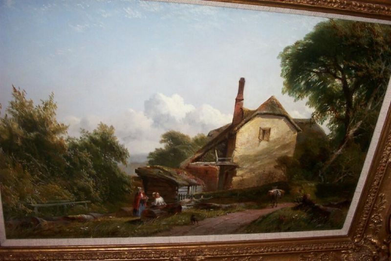 | country landscape with thatched cottage, women talking, donkey, dog, etc | |