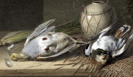 Still life of dead birds, celery and a vase