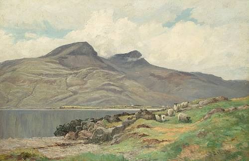 Sheep grazing by a loch