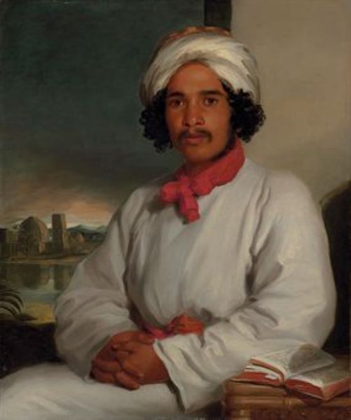 | Portrait of a youth, seated half-length, wearing a white turban and an red scarf, with a temple beyond | |