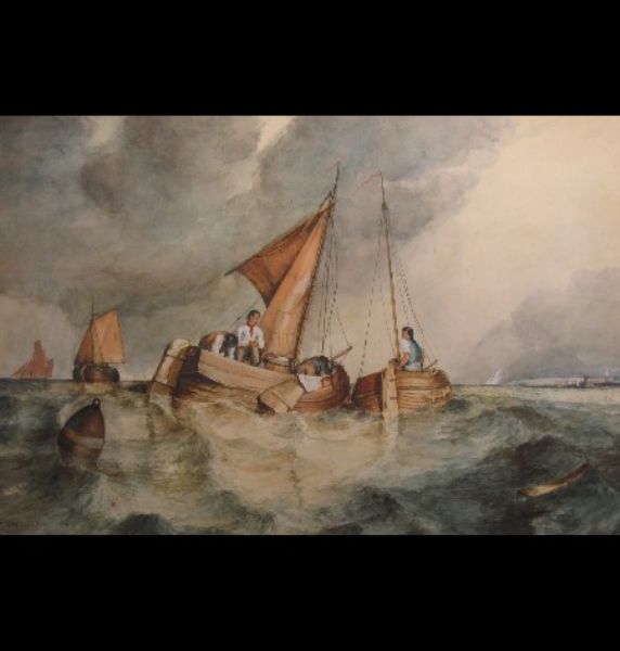 figures in sailing boats on rough seas