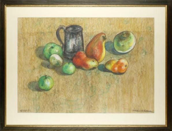 Still life with fruit, veg and pewter tankard