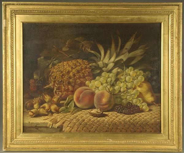 | Pineapple, pears, plums, grapes and hazelnuts with woven reed mat on a table top | |