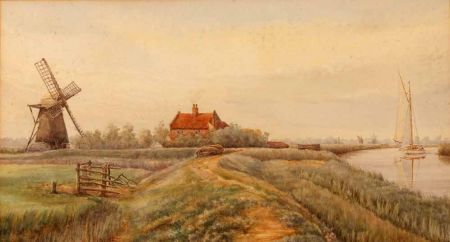 Wherry on the Broads passing a Farm and Windmill