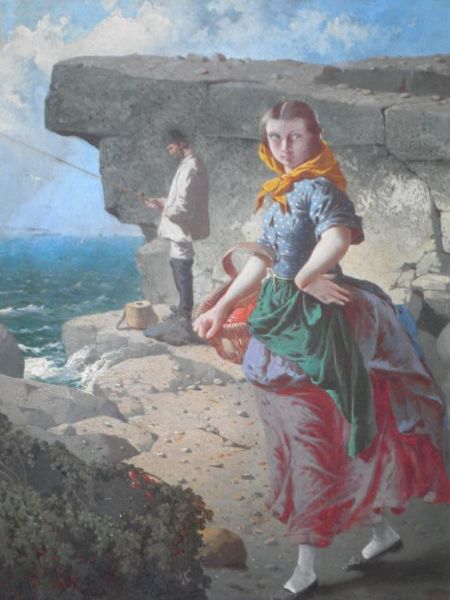 Victorian maiden, gentleman fishing in background
