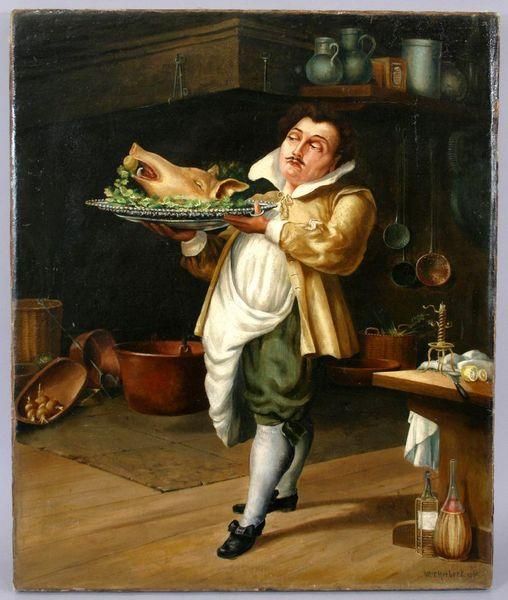 waiter with boar's head on tray