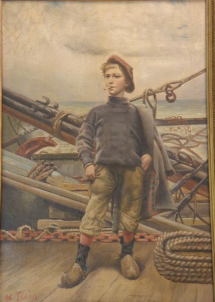| full-length portrait of a young sailor boy wearing a red beret and clogs and smoking a cigarette | |