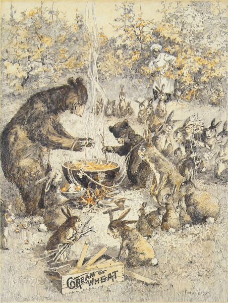 | Bears and rabbits in the woods cooking; chef discovering them | |