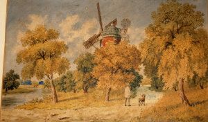 WINDMILL WITH A GENTLEMAN WALKING WITH A DOG