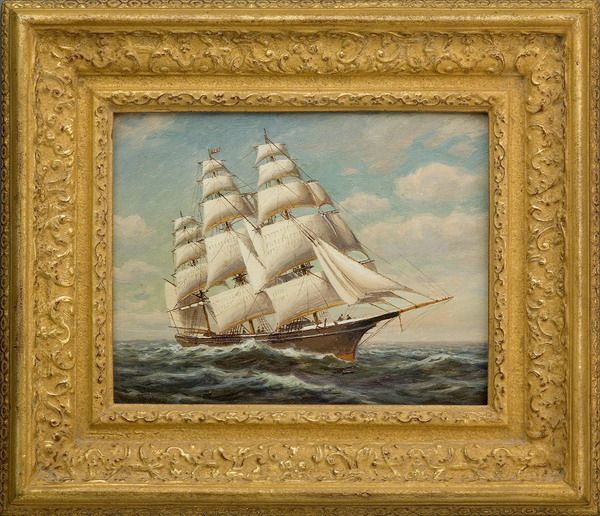 TWO PORTRAITS OF FULL-MASTED CLIPPER SHIPS AT SEA.