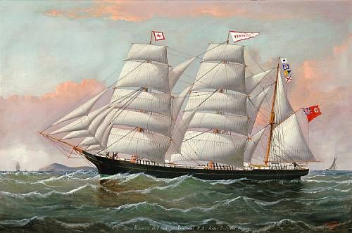 | The British bark Veronica under plain sail off the South Stack lighthouse, Anglesey, North Wales | |