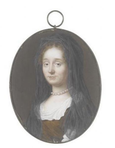 | Mary Eyre née Bigoe, wearing brown dress over white chemise, pearl necklace, her red hair upswept beneath a black translucent ve | |
