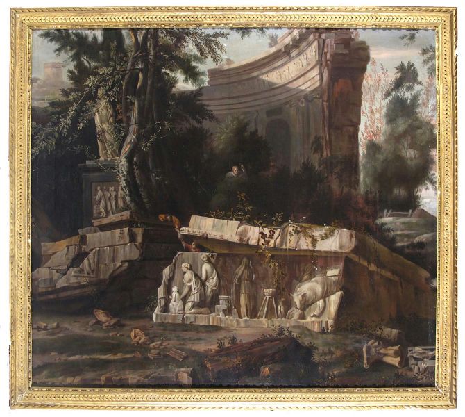 | Rustics amongst Roman ruins and a bas relief mausoleum, a hilltop town beyond | |