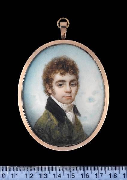 | A young Gentleman, wearing moss-green coat with black collar and white cravat. | |