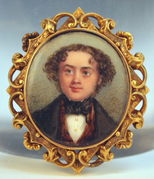 | Oval Miniature Head and Shoulders Portrait of a Gentleman, his Hair in Ringlets and wearing a Tied Bow Cravat, Brown Waistcoat | |