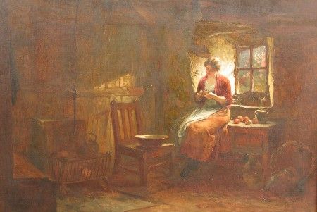 | An interior scene, a solitary female figure in sunlight peeling apples | |