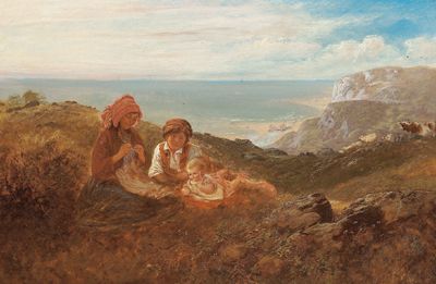 Family Idyll with Pasturing Cattle Over an Ocean Bay