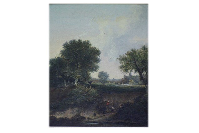 | An East Anglian view with figures, horse and cart and a dog and a church tower in the distance, | |