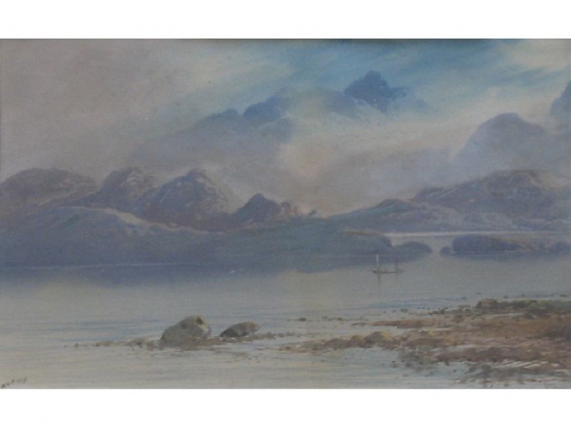 A view of a loch with sailing vessels