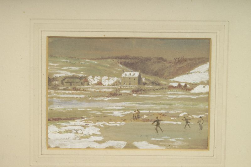 | Figures Skating on a Frozen Pond in a Winter Landscape, a Cottage and Barns in the Distance | |