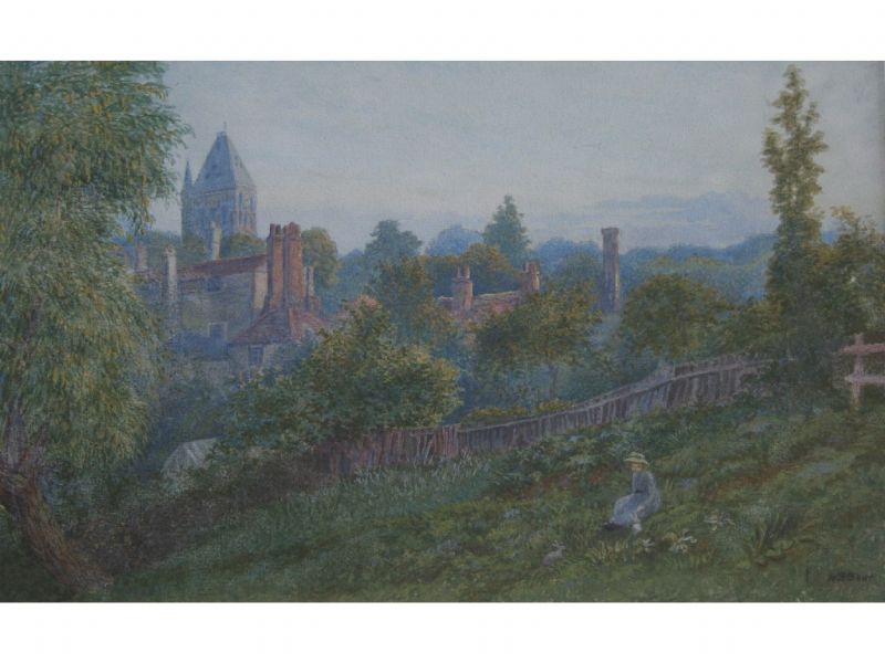 A GIRL WITH RABBITS IN A FIELD NEAR A VILLAGE