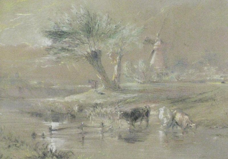 Cattle watering near a windmill