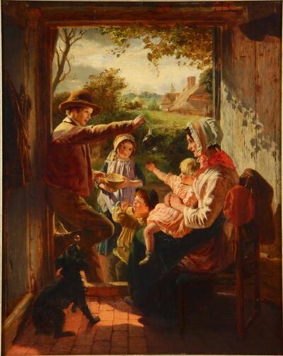 "Blowing Bubbles", oil on panel, signed and titled verso, with his address, Windsor & Newton label, Frost & Reed label & fragment of exhibition label. In red walnut cove frame with gilt liner, OS: 29" x 25", SS: 19 1/2" x 15 1/2". Good condition. | |
