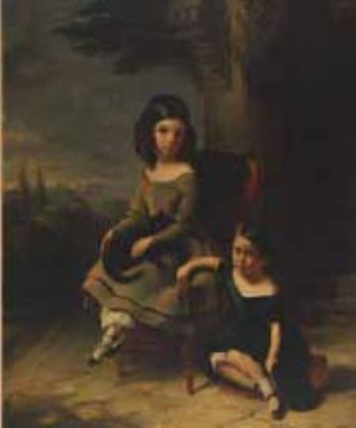 CHILDREN WITH A CAT SEATED IN A LANDSCAPE