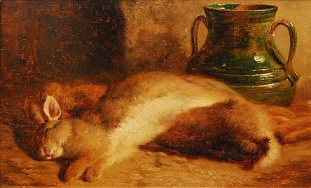 Still life composition with dead rabbit and glazed pot