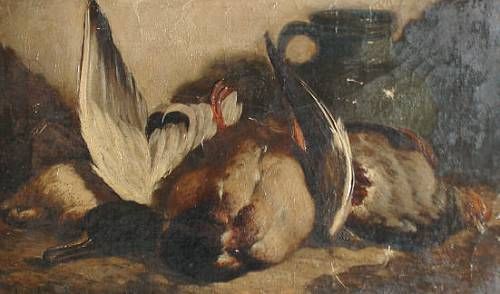 Still life of dead game in a larder