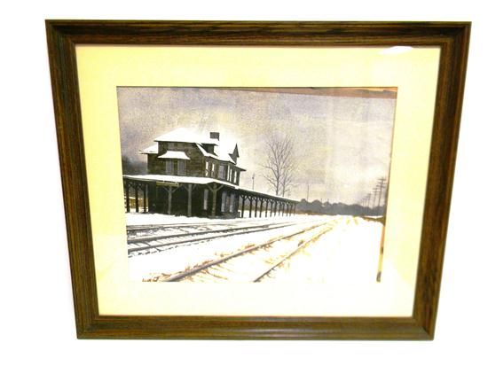 | empty Rochester train station, snow-covered railroad tracks stretching to right middle ground, powder-grey sky with light snow f | |